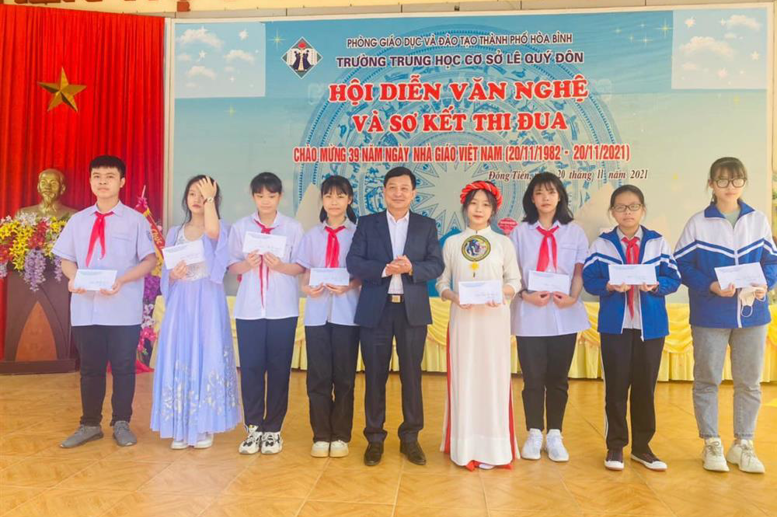 Hôm nay, hoà chung không khí tưng bừng của cả nước chào mừng 39 năm ngày Nhà giáo Việt Nam, trường THCS Lê Quý Đôn long trọng tổ chức Lễ kỷ niệm ngày Nhà giáo Việt Nam 20/11. Về dự buổi lễ hôm nay, trường THCS Lê Quý Đôn vinh dự được chào mừng ông Lê Văn Thành – Chủ tịch UBND phường Đồng Tiến. Ông Đỗ Xuân Chiến – Tổ trưởng tổ dân phố số 2 phường Đồng Tiến. Ông Nguyễn Văn Duấn – trưởng BĐD CMHS và các ông bà trong ban đại diện cha mẹ HS của 16 lớp. Bà Lê Thanh Nhàn – Giám đốc trung tâm phát triển tài năng Superkid. Về phía nhà trường vinh dự có Cô Phạm Thị Hải Châu – Bí thư chi bộ, Hiệu trưởng nhà trường; Cô Phạm Thị Thu Hằng – Phó Bí thư Chi bộ, Phó Hiệu trưởng nhà trường; Cùng toàn thể các thầy giáo, cô giáo, cán bộ nhân viên và các em học sinh trong nhà trường.