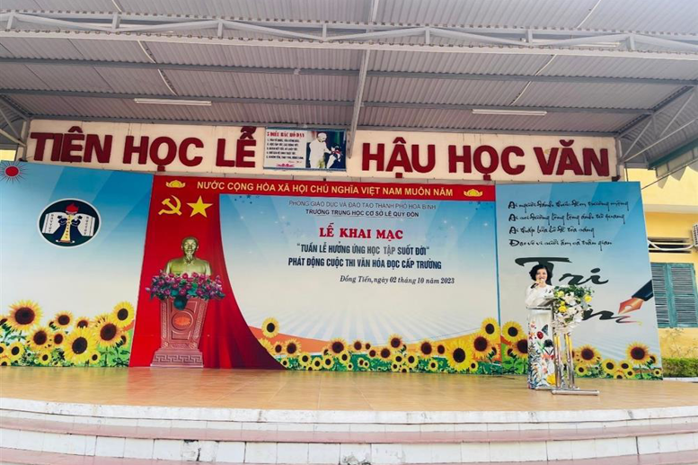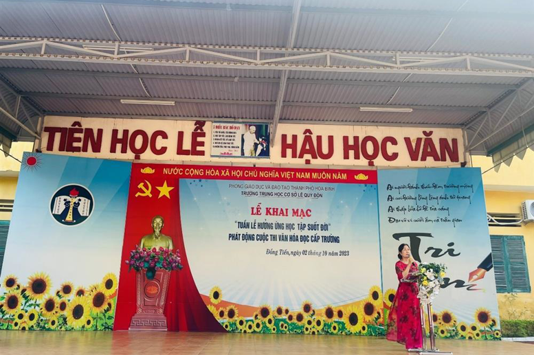 Thực hiện Kế hoạch số 2661/KH-SGD&ĐT ngày 13/9/2023 của Sở Giáo dục và Đào tạo Hòa Bình về việc tổ chức Tuần lễ hưởng ứng học tập suốt đời năm 2023, sáng 02/10/2023, Trường THCS Lê Quý Đôn tổ chức Lễ Khai mạc Tuần lễ hưởng ứng học tập suốt đời năm 2023 với Chủ đề: “Xây dựng năng lực tự học trong kỷ nguyên số”.