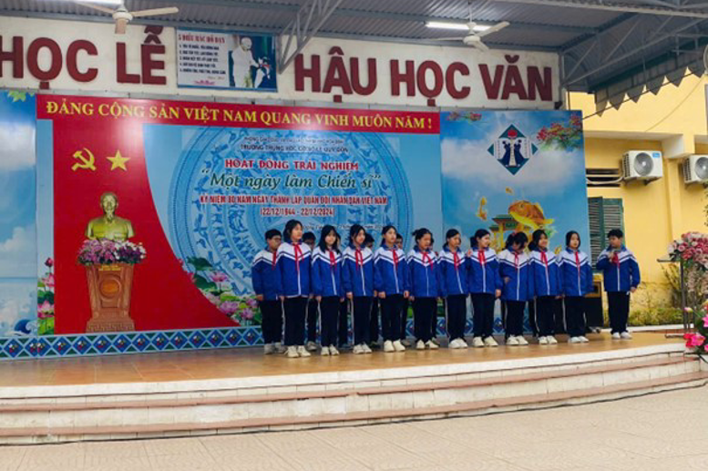 Vâng! Những ca từ ngân vang làm cho không khí sân trường THCS Lê Quý Đôn thêm tưng bừng, rộn rã...Thực hiện kế hoạch các hoạt động Chào mừng 80 năm Ngày thành lập Quân đội Nhân dân Việt Nam, Ngày hội Quốc phòng toàn dân (22/12/1994- 22/12/2024), nhằm giúp các em học sinh hiểu hơn về truyền thống lịch sử vẻ vang của quân đội nhân dân Việt Nam, tự giác thực hiện nghiêm túc nội quy của nhà trường, có ý thức rèn luyện thân thể và biết vận dụng kiến thức, kĩ năng học được vào đời sống hàng ngày, chiều ngày 21/12/2024 trường THCS Lê Quý Đôn đã tổ chức một hoạt động đặc biệt mang tên " Một ngày làm chiến sĩ" dành cho các em học sinh.