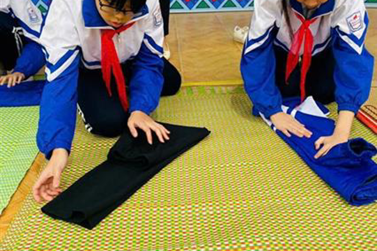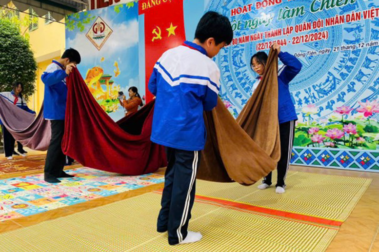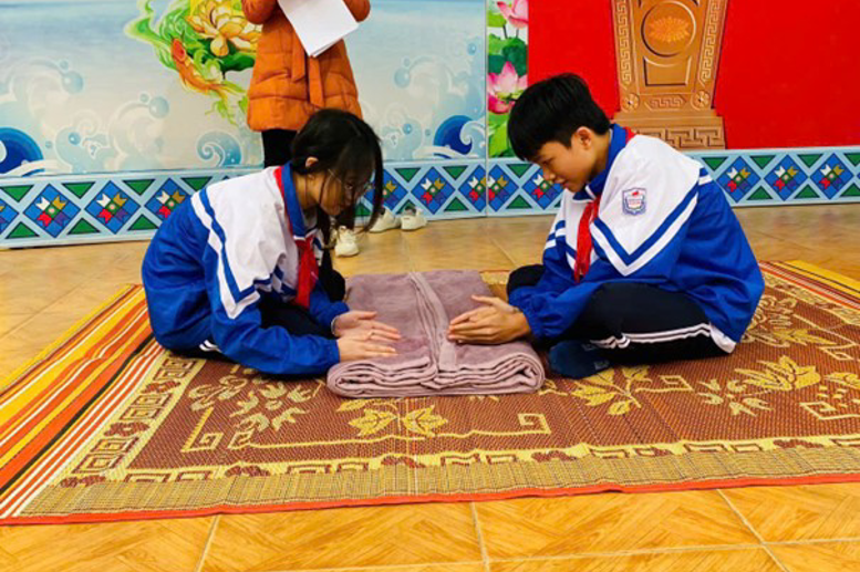 Sau phần thi đội hình- đội ngũ, các em khối 6,7 tiếp tục tham gia vào phần thi gấp quần áo đồng phục còn khối 8,9 gấp chăn mùa đông. Đây là một phần thi đòi hỏi sự tỉ mỉ, khéo léo và chính xác. Qua thử thách này, các em học sinh không chỉ hiểu được sự ngăn nắp, gọn gàng trong cuộc sống quân đội mà còn rèn luyện được sự kiên nhẫn, tỉ mỉ trong công việc hàng ngày.