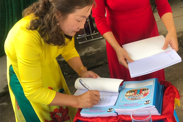 Sau phần giao lưu, trò chuyện với cô Hiệu trưởng, 5 bạn học sinh đã nhận phần quà đặc biệt ý nghĩa, đó là những cuốn vở với lời đề tặng và chữ kí của cô hiệu trưởng trong ngày đầu tiên đến trường. Không khí buổi gặp gỡ trở nên gần gũi, vui tươi hơn bao giờ hết khi các em liên tục bày tỏ tình cảm bằng những tràng pháo tay không dứt.