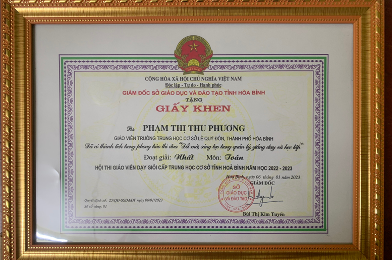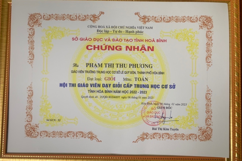 Hội thi Giáo viên dạy giỏi cấp THCS của tỉnh Hòa Bình năm học 2022-2023 đã công nhận 89 Giáo viên dạy giỏi và tặng giấy khen cho 67 cá nhân đoạt giải gồm: 10 giải Nhất, 16 giải Nhì, 20 giải Ba, 21 giải Khuyến khích. Cô giáo Phạm Thị Thu Phương - giáo viên môn Toán trường THCS Lê Quý Đôn xuất săc là 1 trong 3 giáo viên đạt giải Nhất của thành phố, 1 trong 10 giải Nhất của Tỉnh