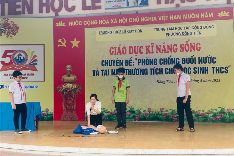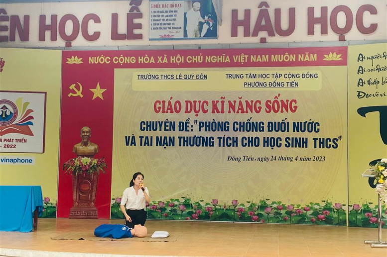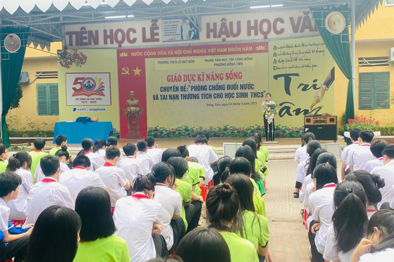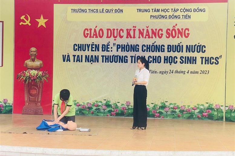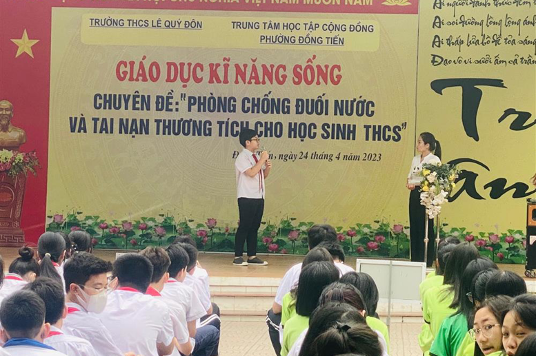Thực hiện Kế hoạch số 226 /PGD&ĐT ngày 12/4/2023 của Phòng GD&ĐT thành phố Hòa Bình về việc Tăng cường đảm bảo an toàn trong trường học; Kế hoạch số12/KH-TTHTCĐ ngày 19/4/2023 của TTHTCĐ phường Đồng Tiến về việc Tổ chức chuyên đề phòng chống đuối nước; Kế hoạch công tác tháng 4/2023 của trường THCS Lê Quý Đôn và tiếp nối các hoạt động của Liên đội nhà trường, sáng ngày 24/04/2023 Trường THCS Lê Quý Đôn phối hợp với Trung cấp y tế Hòa Bình tổ chức Chương trình ngoại khóa tuyên truyền về kỹ năng phòng, chống đuối nước và tai nạn thương tích cho học sinh toàn trường.