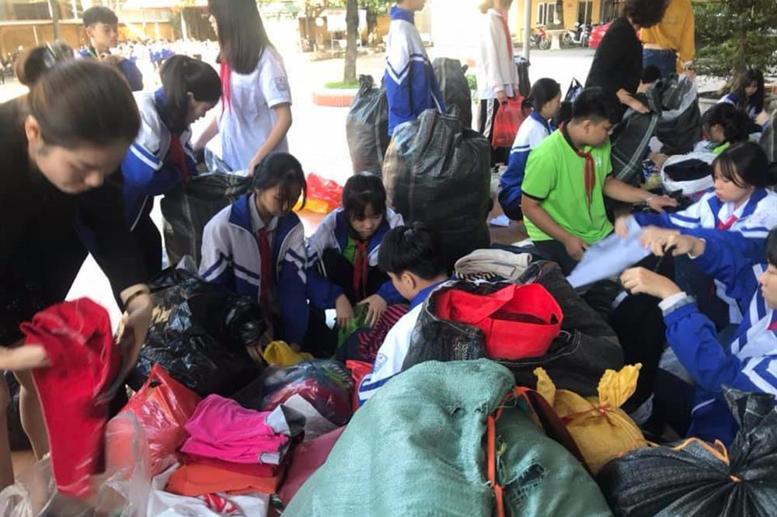 Sau chương trình phát động, các thầy cô cùng các e đã sắp xếp, đóng gói (túi nilon dày bên trong, bao tải dứa ơi ngoài) hơn 40 bao tải lớn gồm quần áo, chăn màn, giày dép... Số tiền hơn 13 triệu cũng sẽ được chuyển đến tài khoản của Thành đoàn ngay trong hôm nay.
