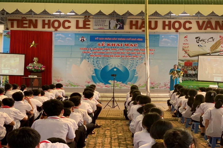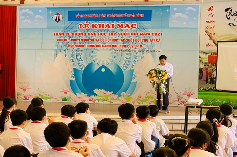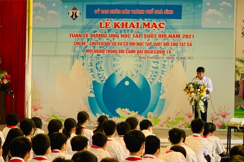 Sáng ngày 1/10/2021, tại Trường THCS Lê Quý Đôn, UBND thành phố Hòa Bình đã long trọng tổ chức khai mạc Tuần lễ hưởng ứng học tập suốt đời năm 2021 với chủ đề: “Chuyển đổi số và cơ hội học tập suốt đời cho tất cả mọi người trong bối cảnh đại dịch Covid – 19”.