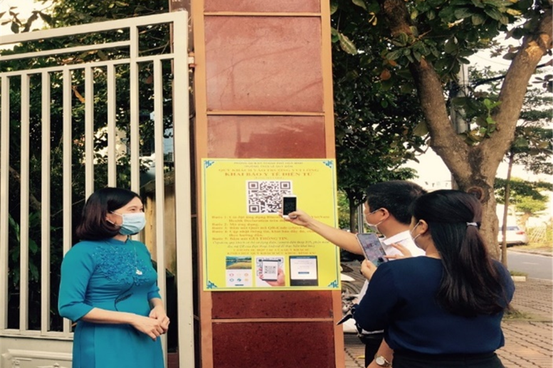 Các vị đại biểu khai báo y tế trước khi vào dự Lễ khai mạc