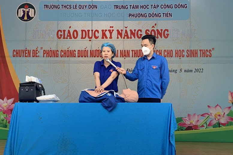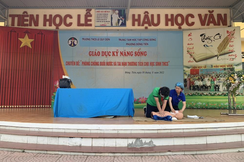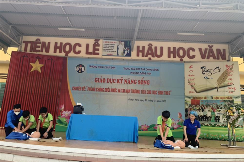 Theo số liệu thống kê của Cục trẻ em (Bộ lao động thương binh và xã hội) 5 tháng đầu năm 2022, cả nước có 113 trẻ bị tử vong do đuối nước. Hằng năm nước ta có rất nhiều vụ tai nạn đuối nước thương tâm xảy ra đặc biệt tỷ lệ trẻ em bị tử vong do đuối nước chiếm tỷ lệ rất cao, đây cũng chính là vấn đề mà trường ta rất quan tâm. Nhằm nâng cao nhận thức, đồng thời cung cấp các kỹ năng cơ bản cho các em học sinh để có thể phòng tránh đuối nước nếu không may gặp phải trong thực tế. Ngày 18/05/2022, trường THCS Lê Quý Đôn phối hợp cùng với trung tâm học tập cộng đồng phường Đồng Tiến tổ chức hoạt động ngoại khóa với chủ đề: “Phòng chống đuối nước và tai nạn thương tích cho học sinh THCS”