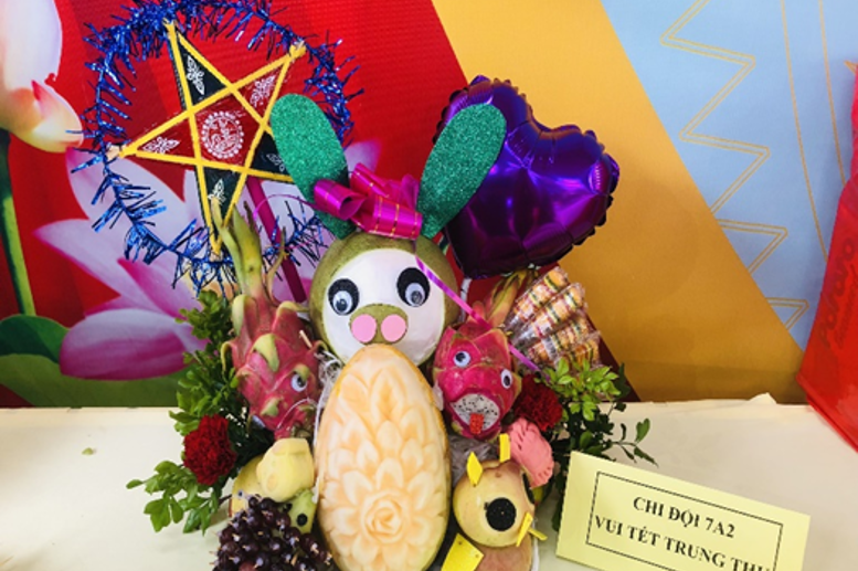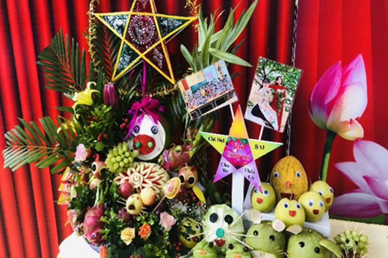 Mặc dù thời gian chuẩn bị rất ngắn trong bối cảnh trời đang mưa, nhưng với bàn tay khéo léo và tình yêu thương, PHHS các lớp đã chuẩn bị chu đáo các loại bánh trái để các em được cùng các thầy cô thực hành trải nghiệm bày những mâm ngũ quả. Với bánh nướng, bánh dẻo, quả dứa, quả cam, trái hồng, trái bưởi căng tròn qua sự hướng dẫn của cha mẹ, thầy cô các em đã khéo léo “biến hình” thành những chú hề, chủ lợn ỉn hay cậu nhím đang xù lông ngộ nghĩnh. Chỉ có thể nói rằng: mỗi mâm cỗ chứa đựng những tình cảm của những bậc cha mẹ, thầy cô và cả sự tỉ mỉ khéo léo, sáng tạo của những bạn học trò nhỏ bé từ lớp 6 đến lớp 9.