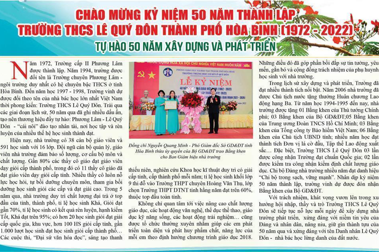 CHÀO MỪNG KỶ NIỆM 50 NĂM THÀNH LẬP TRƯỜNG THCS LÊ QUÝ ĐÔN THÀNH PHỐ HÒA BÌNH (1972-2022)