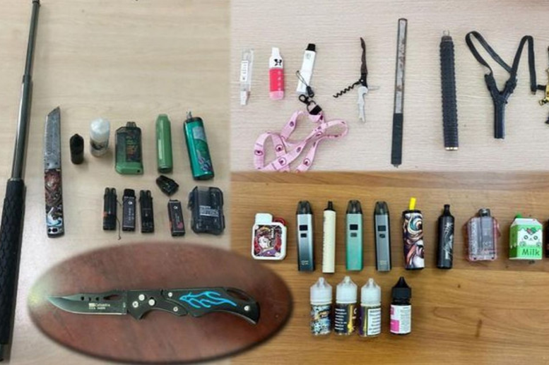 Kết quả, công an đã phát hiện, thu giữ 152 dao, kéo các loại (dao gọt hoa quả, dao tự chế, dao găm, dao bấm, dao bầu, dao thái thịt, dao đi rừng..); 27 côn nhị khúc, gậy ba khúc, tuýp sắt, gậy gỗ; 24 đồ chơi nguy hiểm (súng bắn đạn nhựa, dao nhựa, bình xịt hơi cay, dùi cui điện tự chế..); 23 kìm, cờ-lê, tua-vít, búa; 91 máy hút và 16 lọ tinh dầu thuốc lá điện tử; 10 gói thuốc lá; 2 học sinh tàng trữ cỏ Mỹ và cần sa…