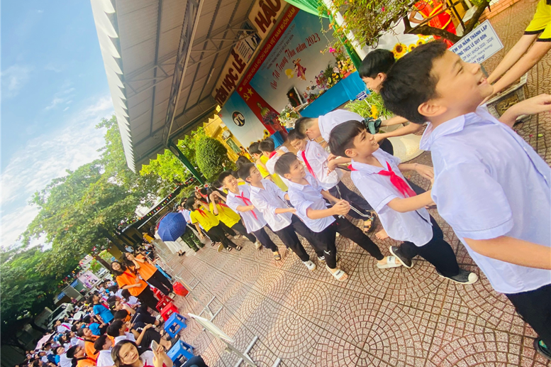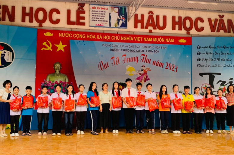 Chiều ngày 29/9/2023, tại trường THCS Lê Quý Đôn, thành phố Hòa Bình, hơn 600 em học sinh đã được đón Tết Trung thu thật vui vẻ, ý nghĩa. Bao ngày mong đợi mùa Trung thu lại về đâu đây trên từng dãy phố, nơi khung cửa sổ ta ngồi, nơi góc lớp thân quen. Đâu đâu cũng mang dáng hình, mang sắc thu dịu nhẹ. Các bạn học sinh với những đôi mắt trong veo, lòng ấp ủ những mong đợi,… Ngay từ tuần học trước đó BGH nhà trường đã chỉ đạo Liên đội xây dựng kế hoạch tổ chức đón Tết Trung thu cho các em học sinh thật chu đáo. Các thầy, cô giáo chủ nhiệm cũng đã phối hợp với các bậc cha mẹ học sinh dự kiến tổ chức cho các con đón Tết Đoàn viên thật vui, thật sum vầy. Vậy mà mấy ngày nay trời cứ vô tình đổ mưa mang theo bao ánh mắt lo lắng, mong chờ, hi vọng.