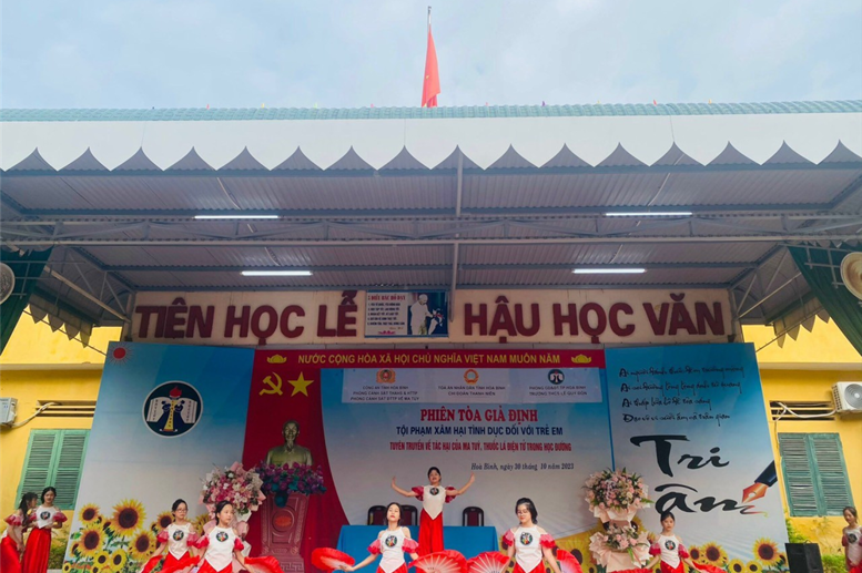 Ngoài việc nâng cao chất lượng dạy và học, trường THCS Lê Qúy Đôn luôn luôn chú trọng việc tổ chức các hoạt động ngoại khóa, lồng ghép các kiến thức về đạo đức, pháp luật để tuyên truyền cho các em học sinh. Thực hiện Kế hoạch số 2986/KH-SGDĐT ngày 06/10/2023 của Sở GD&ĐT Hòa Bình về triển khai thực hiện dự án phòng chống tội phạm và phòng chống vi phạm pháp luật cho HS, SV, học viên đến năm 2025, định hướng đến năm 2030 cuả ngành GD&ĐT; Kế hoạch số 556 ngày 25/8/2023 của Phòng GD&ĐT TP Hòa Bình về Tổ chức thực hiện Ngày Pháp luật năm 2023. Được sự thống nhất giữa các đơn vị về lựa chọn địa điểm Thực hiện Công văn số 2667/CAT-PV01 ngày 20/10/2023 của Công an tỉnh Hòa Bình về việc tổ chức Giao lưu văn nghệ và tuyên truyền, phổ biến pháp luật về bảo đảm an ninh, trật tự năm 2023. Chiều ngày 30/10 Trường THCS Lê Qúy Đôn phối hợp với Phòng Cảnh sát thi hành án hình sự và hỗ trợ tư pháp, Phòng Cảnh sát điều tra tội phạm về ma túy Công an Tỉnh, Tòa án nhân dân Tỉnh tổ chức Phiên tòa giả định “Tội phạm xâm hại tình dục đối với trẻ em và tuyên truyền về tác hại của ma túy, thuốc lá điện tử trong học đường”.
