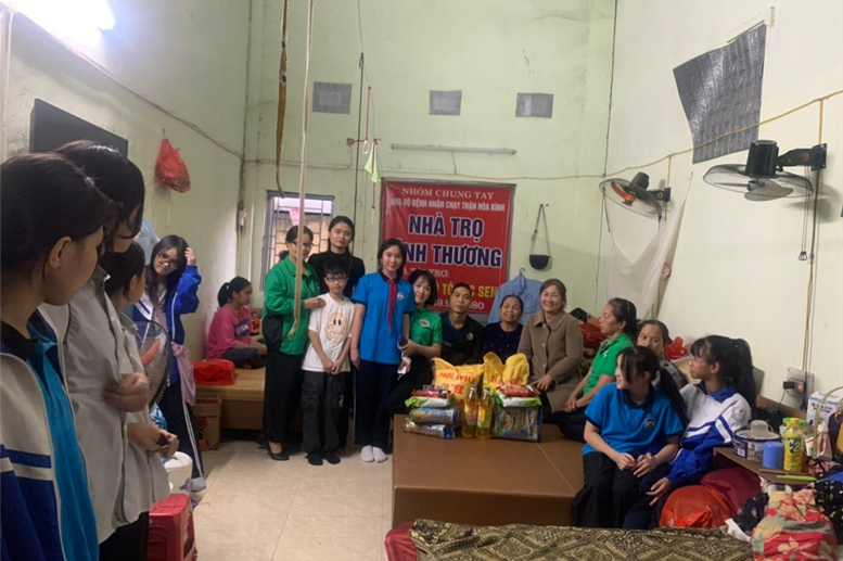 Tiếp đó, nhóm thiện nguyện còn đi thăm, tặng quà cho những bệnh nhân nghèo bị phải chạy thận lọc máu tại Bệnh viện tỉnh Hòa Bình và Bệnh viện thành phố Hòa Bình. Việc làm này đã trở thành việc làm thường xuyên, một tháng một lần CLB Thiện nguyện tổ chức thăm, tặng quà cho các bệnh nhân nghèo, khó khăn. Nhóm sẽ trao các phần quà là những nhu yếu phẩm cần thiết như: gạo, dầu ăn, gia vị, bánh, mỳ tôm…. Nguồn kinh phí của nhóm đều dựa vào việc vận động đóng góp và sự hỗ trợ của Cán bộ, giáo viên, nhân viên và bạn HS trong nhà trường. Bên cạnh đó CLB kêu gọi các nhà hảo tâm, các mạnh thường quân là phụ huynh HS ủng hộ trên tinh thần tự nguyện. Qua đó, kết nối yêu thương, giúp đỡ người nghèo, người có hoàn cảnh khó khăn, những bệnh nhân đang điều trị tại các cơ sở y tế… trên địa bàn thành phố. Đây là việc làm có ý nghĩa, đem lại niềm vui cho những mảnh đời bất hạnh, không may mắn.