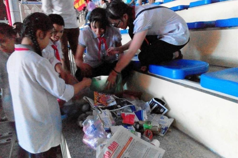 Kết thúc chương trình, các em tự giác thu gom rác thải trả lại hàng ghế sạch đẹp như ban đầu.