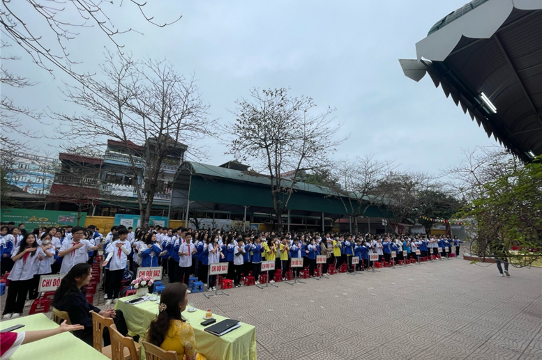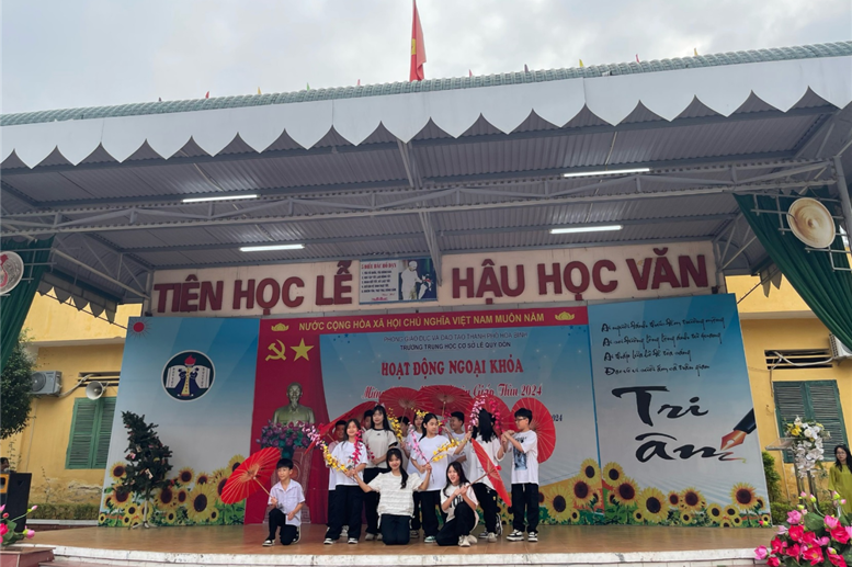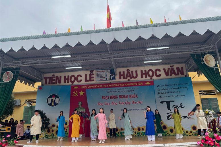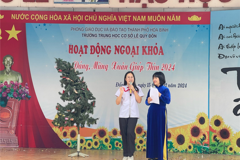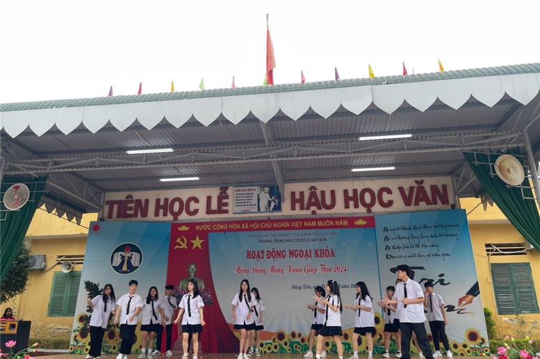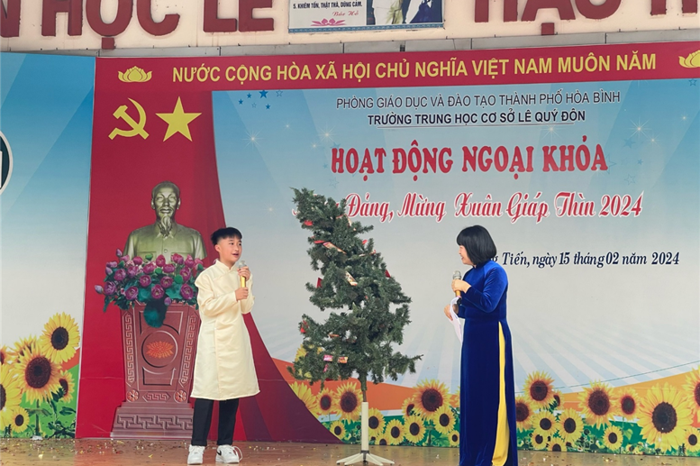 Hôm nay ngày 15/2/2024 tức ngày (6/1/2024 âm lịch), tại Trường THCS Lê Quý Đôn các hoạt động công tác, giảng dạy và học tập bình thường theo đúng Kế hoạch thời gian năm học 2023-2024. Không khí hân hoan, rạo rực sắc xuân lan tỏa khắp ngôi trường. Từng nét mặt, từng nụ cười, lời chúc ấm áp niềm hạnh phúc. Đội ngũ cán bộ, giáo viên, nhân viên và hơn 600 học sinh đã có mặt đông đủ, đúng thời gian. Từ 8h00 đến 9h00 hoạt động chào xuân đã diễn ra rất ấn tượng với 4 tiết mục văn nghệ của liên quân HS 4 khối lớp và tiết mục văn nghệ đặc sắc của các thầy cô giáo. Mở màn là tiết mục văn nghệ của các em HS khối 6 «Tết đong đầy» rất vui khỏe, hồn nhiên; tiếp đến là tiết mục múa hiện đại «Vì sao phải hốt» vừa duyên dáng, vừa năng động trong những tà áo dài của các em HS khối lớp 7; các em HS khối lớp 8 cũng đã mang đến một tiết mục văn nghệ rất ấn tượng «Như hoa mùa xuân», các anh chị HS khối lớp 9 với tiết mục văn nghệ sôi động «Mashup Em xinh-tò te ti ». Khép lại các tiết mục văn nghệ chào xuân là tốp ca do các thầy cô giáo trong Chi đoàn GV thể hiện «Mùa xuân long phụng sum vầy». Sau các tiết mục văn nghệ các em học sinh còn phấn khởi tham gia hái hoa dân chủ với các câu hỏi chào xuân ý nghĩa và nhận các bao lì xì từ các thầy cô giáo.